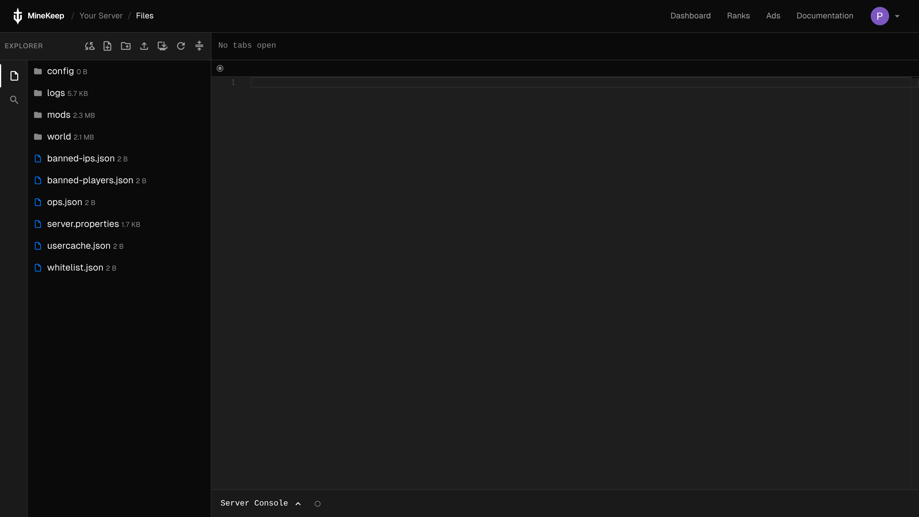 Now that you have the Fabric mod you want to add to your server, go to the [MineKeep Dashboard](https://minekeep.net/servers) and select the cog icon next to the name of your server. This will bring you to the management page for your server. It should look something like this: